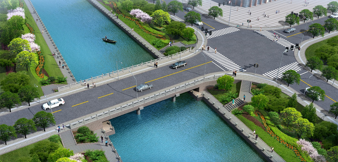 项目规模:道路共3条,总长1947米,桥梁3座 设计内容:道路、交通、桥梁、给排水管线、照明、绿化等